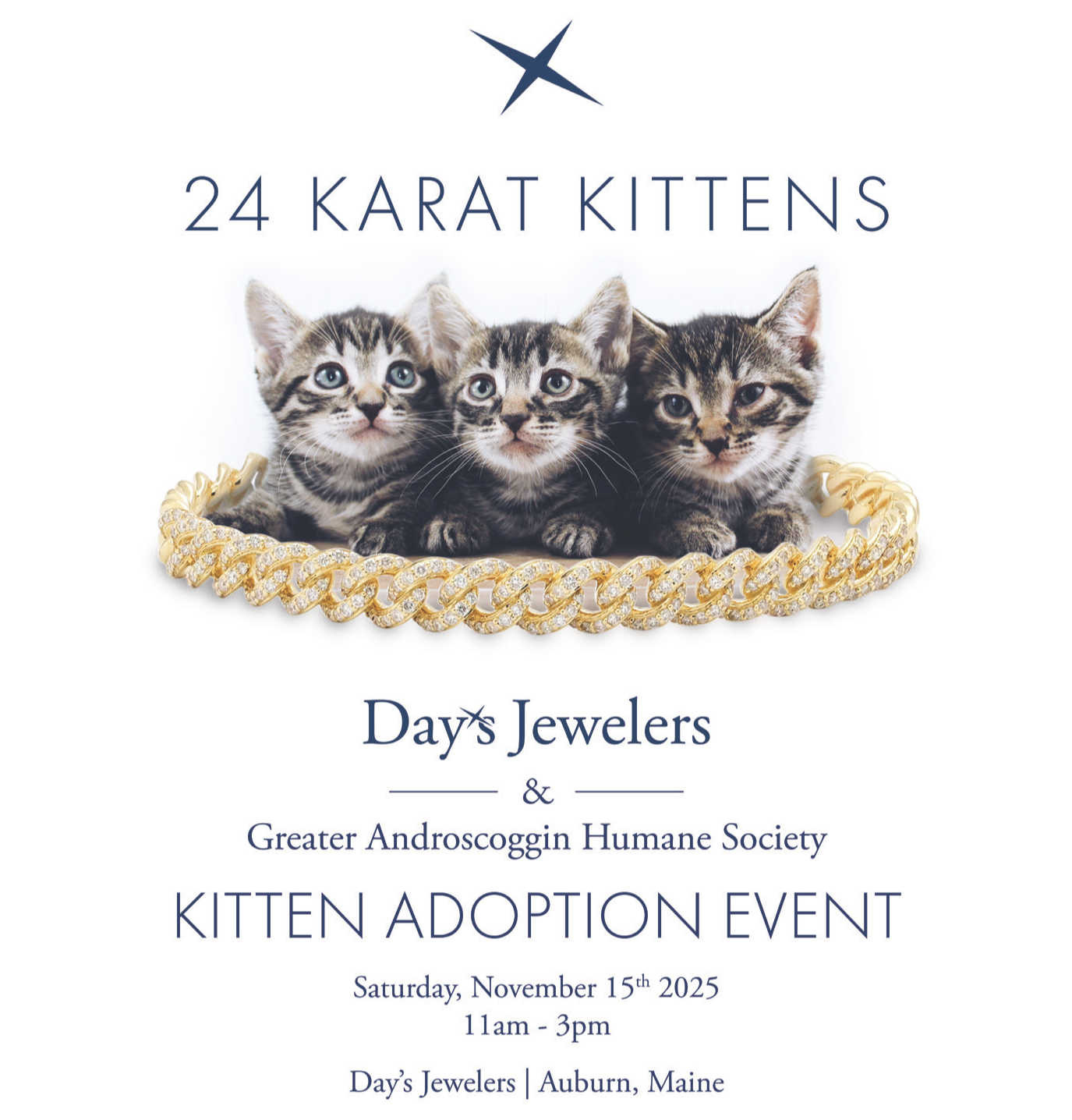 Join us in our Auburn store on Saturday, November 15th from 11am to 3pm to meet adorable kittens looking for their FURever homes. In addition to kitten cuddles, attendees are invited to bring in-kind donations for GAHS. All proceeds from purchases of our Sterling Silver Paw Print Bolo Bracelet and/or Sterling Silver Paw Necklace will go to support the vital work of GAHS. Limited quantities available, while supplies last.