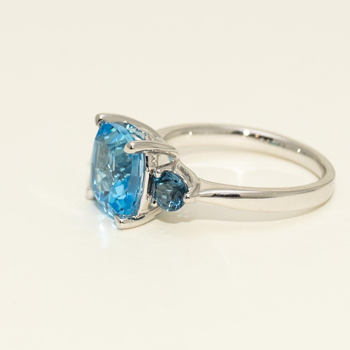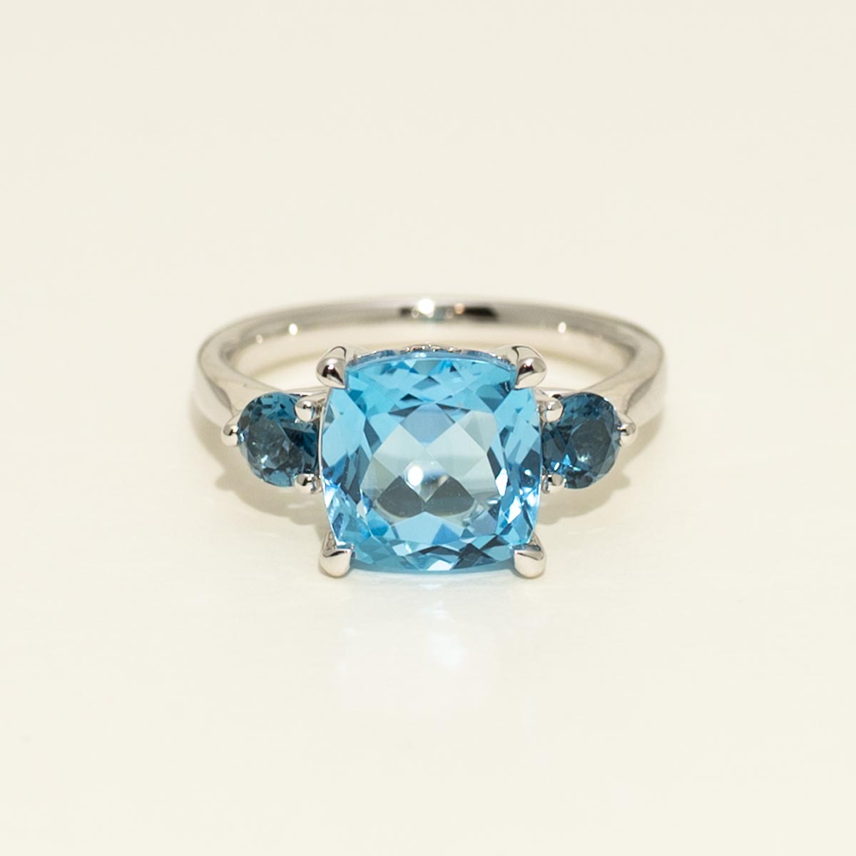 Cushion Cut Blue Topaz Three Stone Ring in 14kt White Gold